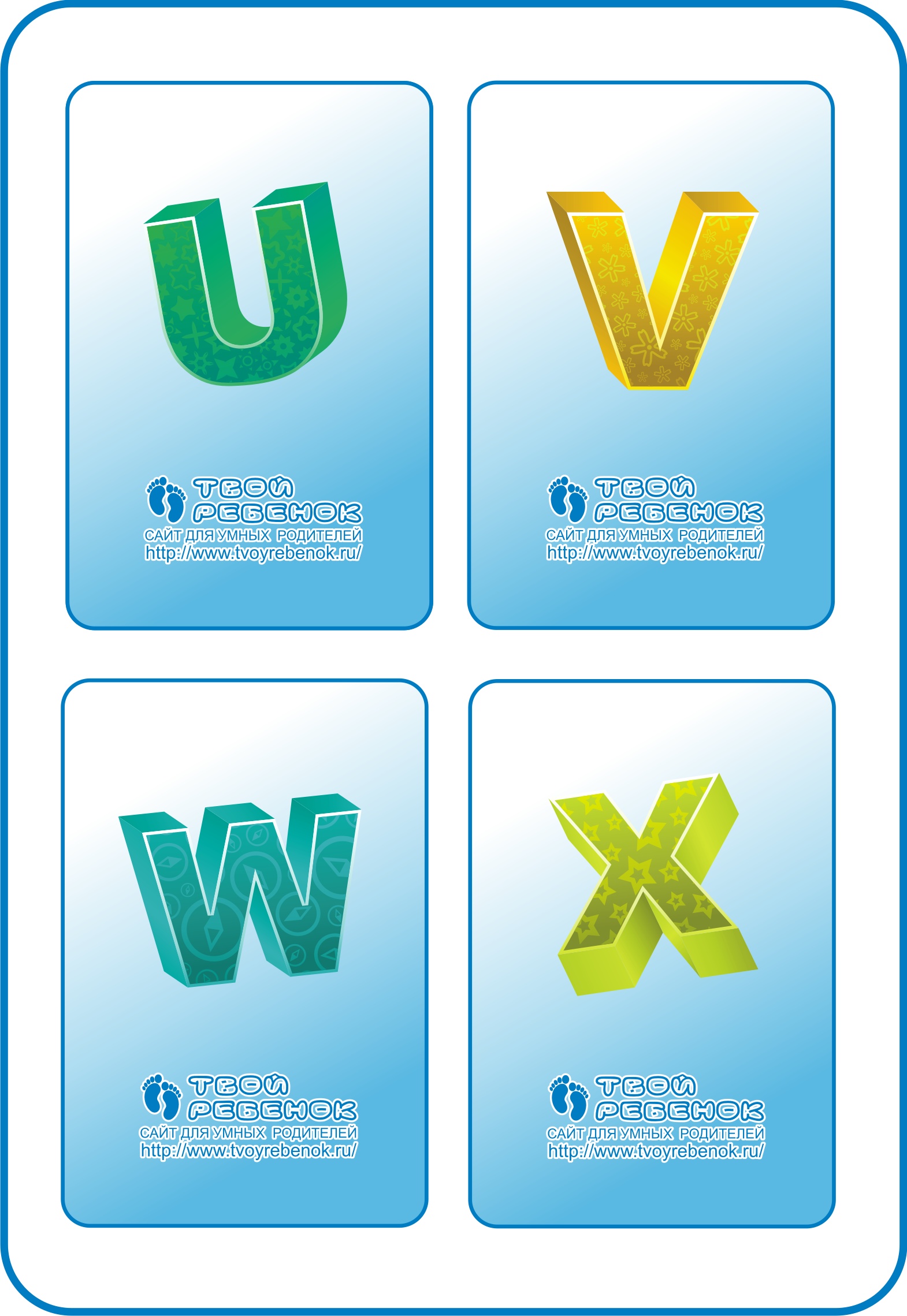 Картка із англійськими літерами U, V, W, X для навчання дитини англійським алфавітом
