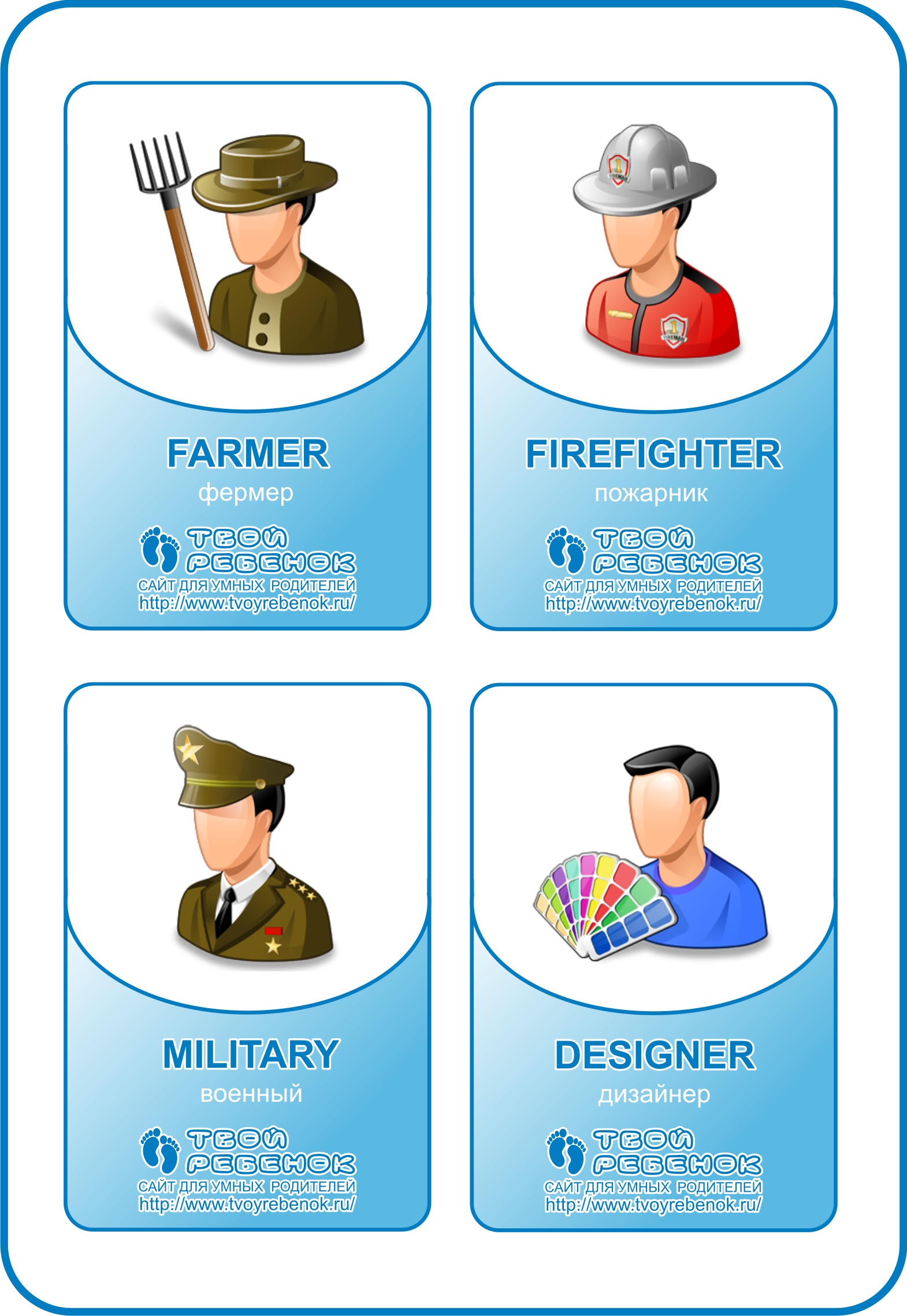 Англійська мова - тема професії. Скачайте англійські картки, підготовлені дизайнером сайту "Твій ребенок.ру" для навчання дітей англійської мови! Клацніть на зображення, збережіть його, надрукувати на кольоровому або чорно-білому принтері. Формат матеріалу - А4.