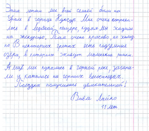 "Цього літа ми всією сім'єю були на Уралі в місті Кунгур. Мені дуже сподобалося у Крижаній печері, куди ми ходили на екскурсію. Там дуже красиво, але холодно. У деяких гротах є підземні озера, в яких живуть маленькі рачки.