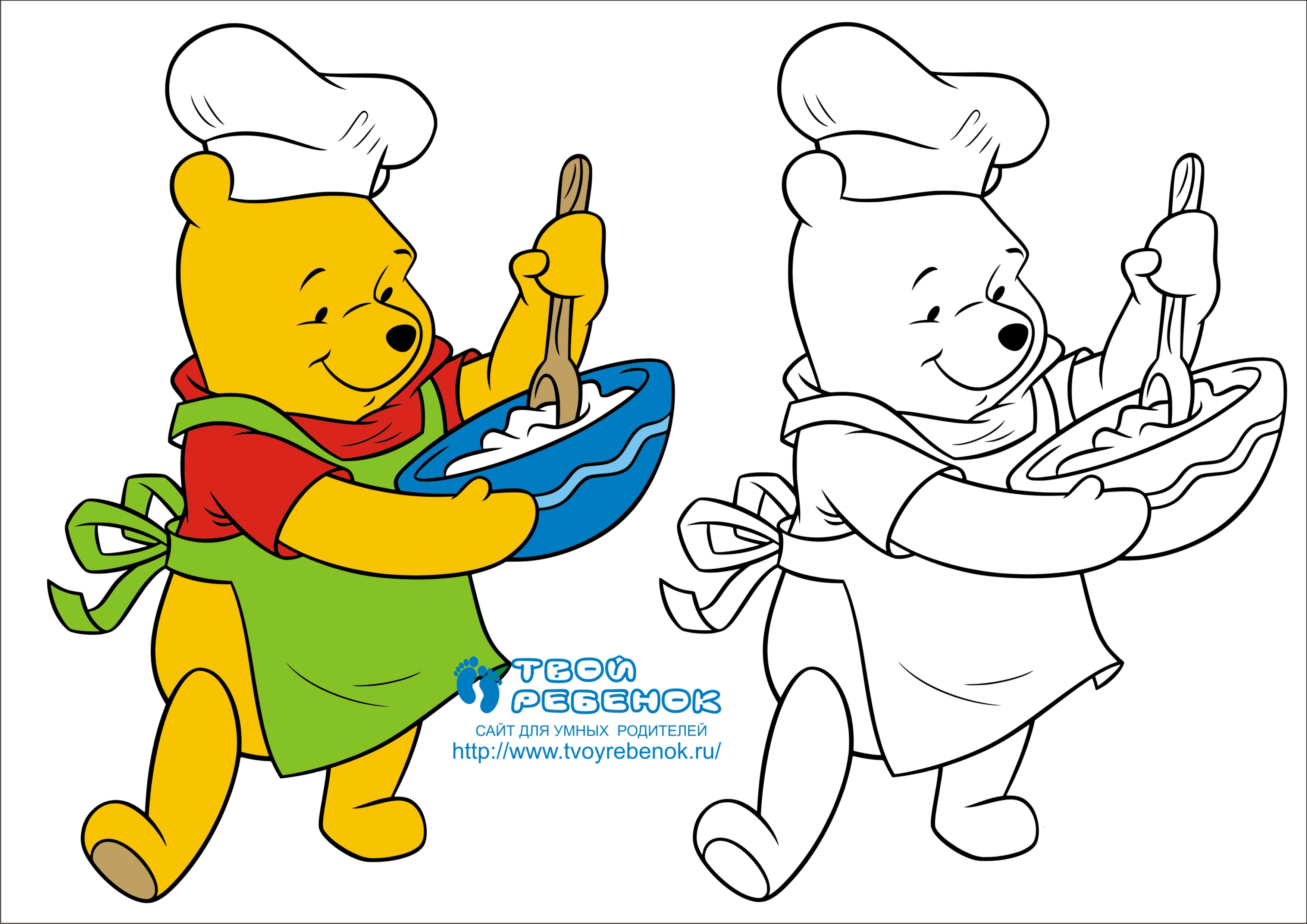 Розмальовка для дітей "Вінні Пух готує їжу". Ви можете завантажити цю розмальовку безкоштовно і роздрукувати її на кольоровому принтері. |