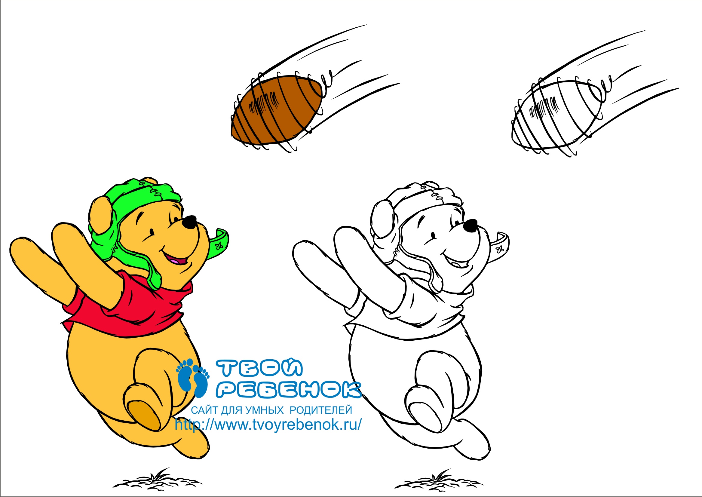 Розмальовка для дітей "Вінні Пух ловить м'яч". Ви можете завантажити цю розмальовку безкоштовно і роздрукувати її на кольоровому принтері. |