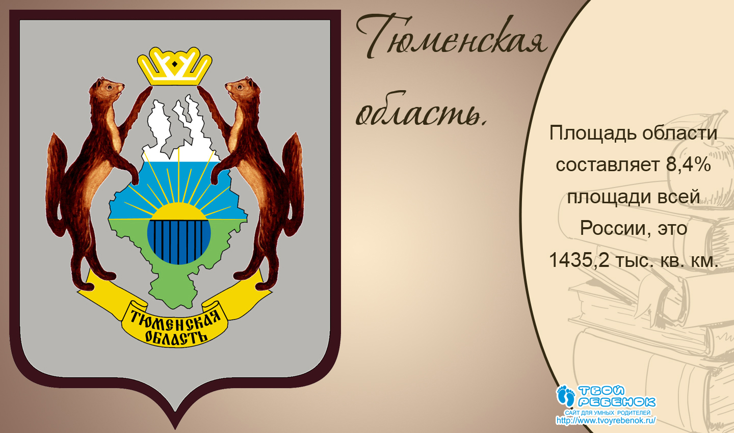 Найбільша область у Російській Федерації - це Тюменська область. Площа області становить 8,4% площі всій Росії, це 1435,2 тис. кв. км. Протяжність Тюменської області з півночі на південь - понад 2100 км, а з заходу на схід - близько 1400 км.