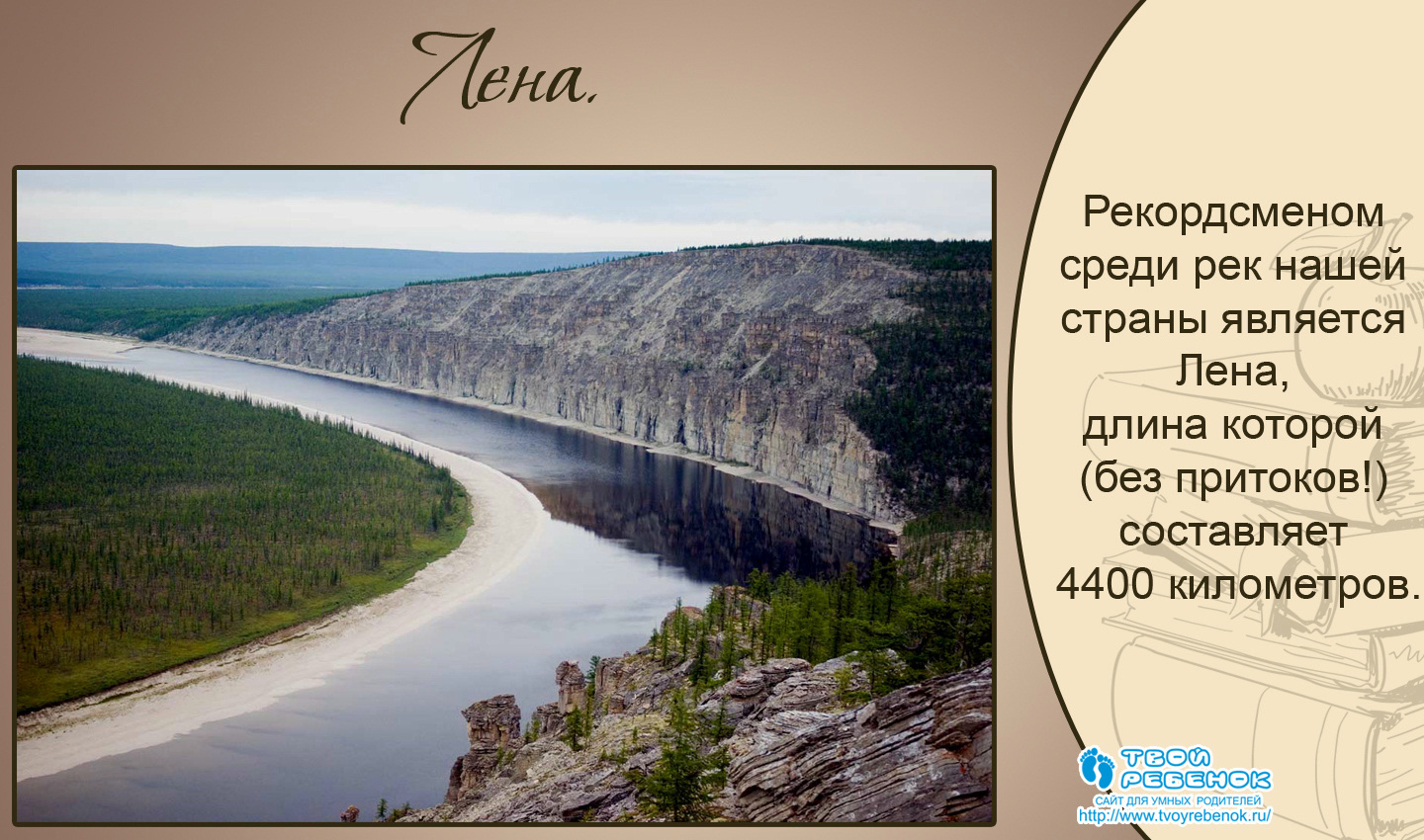 Рекордсменом серед річок нашої країни є Лена, довжина якої (без приток!) становить 4400 кілометрів.