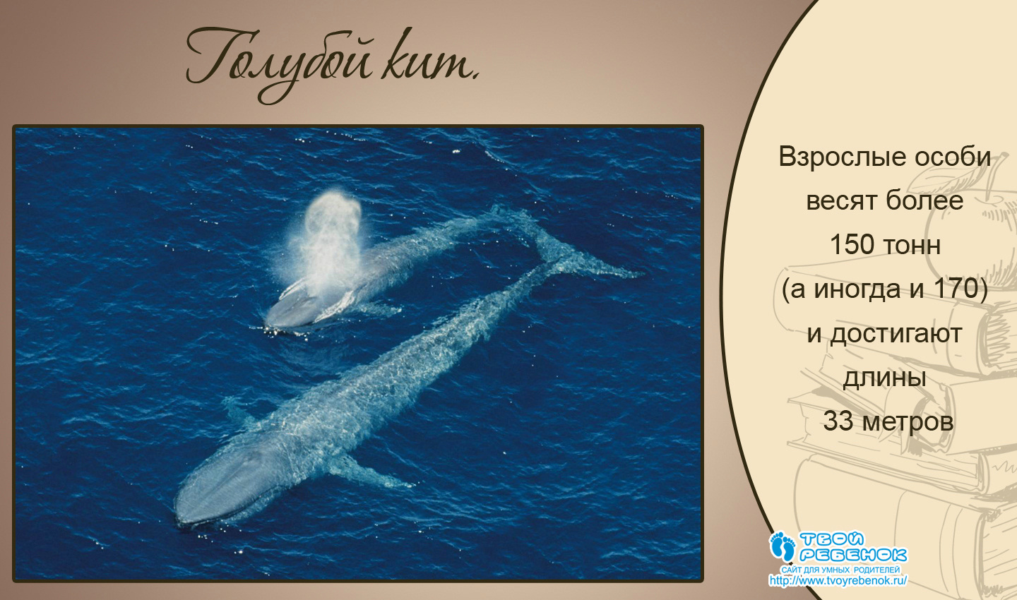 Дорослі особини блакитного кита важить більше 150 тонн (а іноді і 170) і досягають довжини 33 метрів.