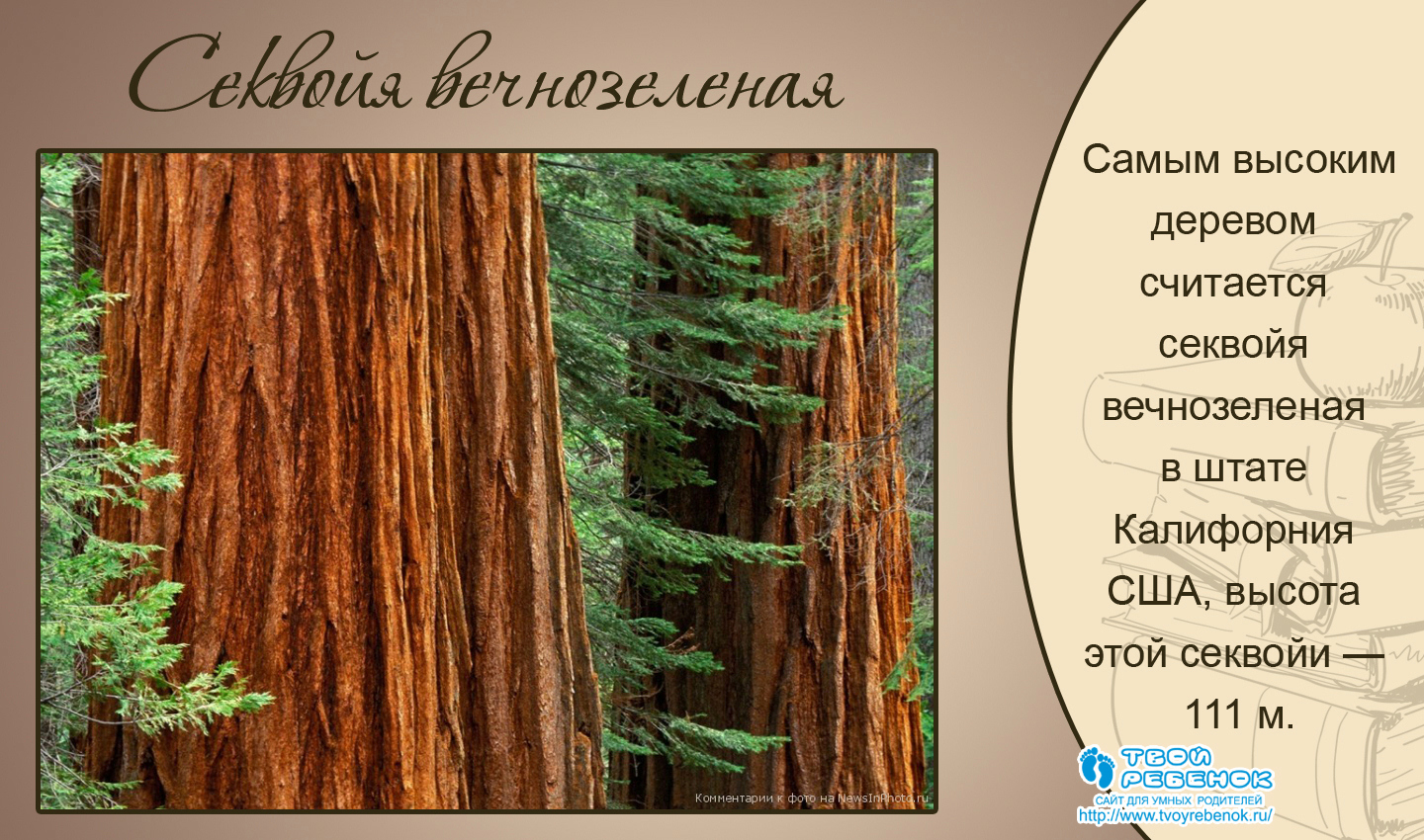 Найвищим деревом вважається секвоя вічнозелена (лат. Sequoia sempervirens) в штаті Каліфорнія, США, висота цієї секвої - 111 м.