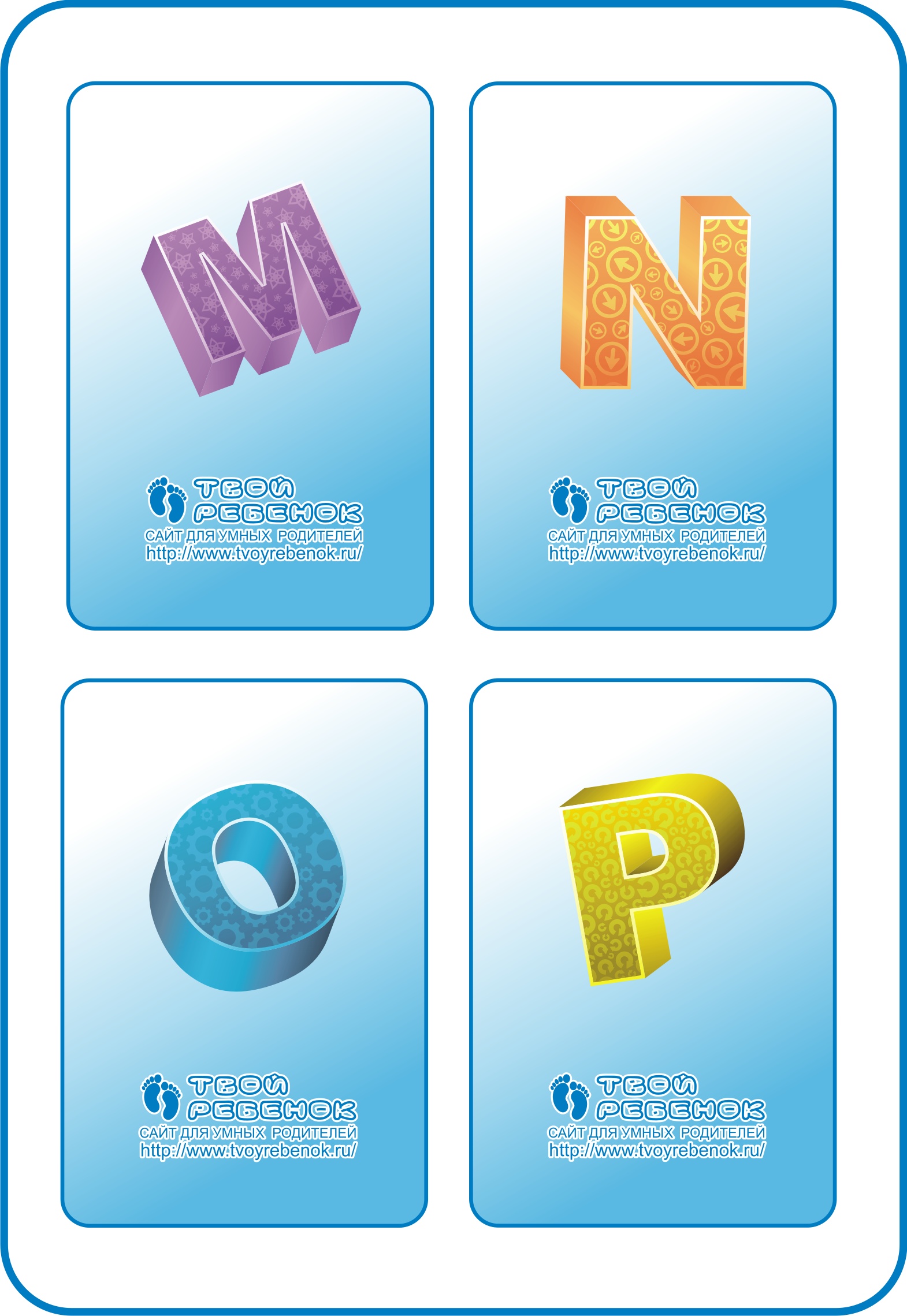 Картка із англійськими літерами M, N, O, P для навчання дитини англійським алфавітом