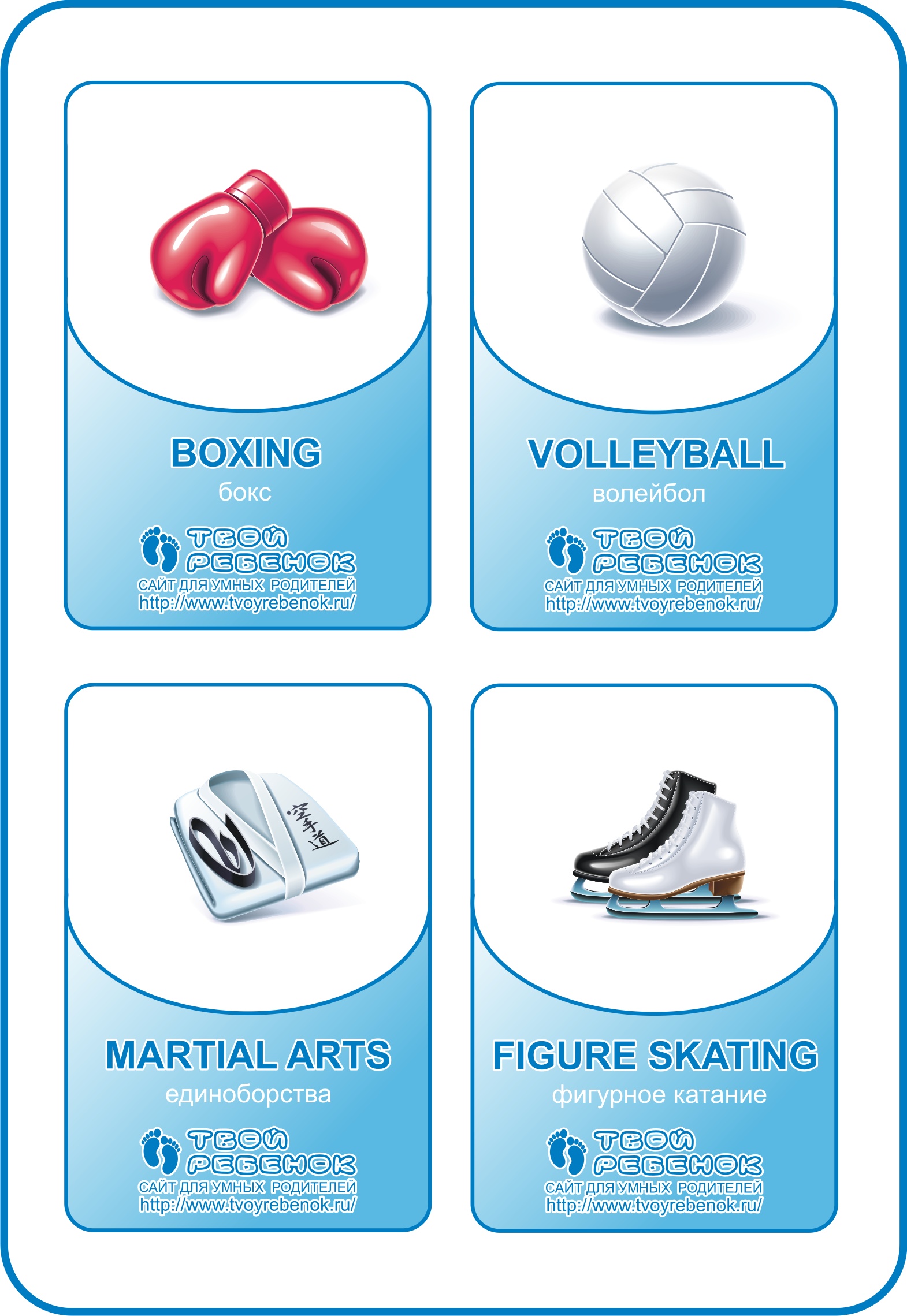 Англійські слова на тему Спорт. Скачайте безкоштовно англійські картки, підготовлені дизайнером сайту "Твій ребенок.ру" для навчання дітей англійської мови! Клацніть на зображення, збережіть його, надрукувати на кольоровому або чорно-білому принтері. Формат матеріалу - А4.