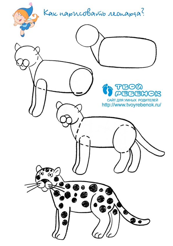 Як намалювати леопарда простим олівцем поетапно? Подивіться на цей простий схематичний малюнок леопарда, який дозволити натренувати руку дитини для письма, а також буде сприяти розвитку у нього абстрактного мислення, посидючості, акуратності.
