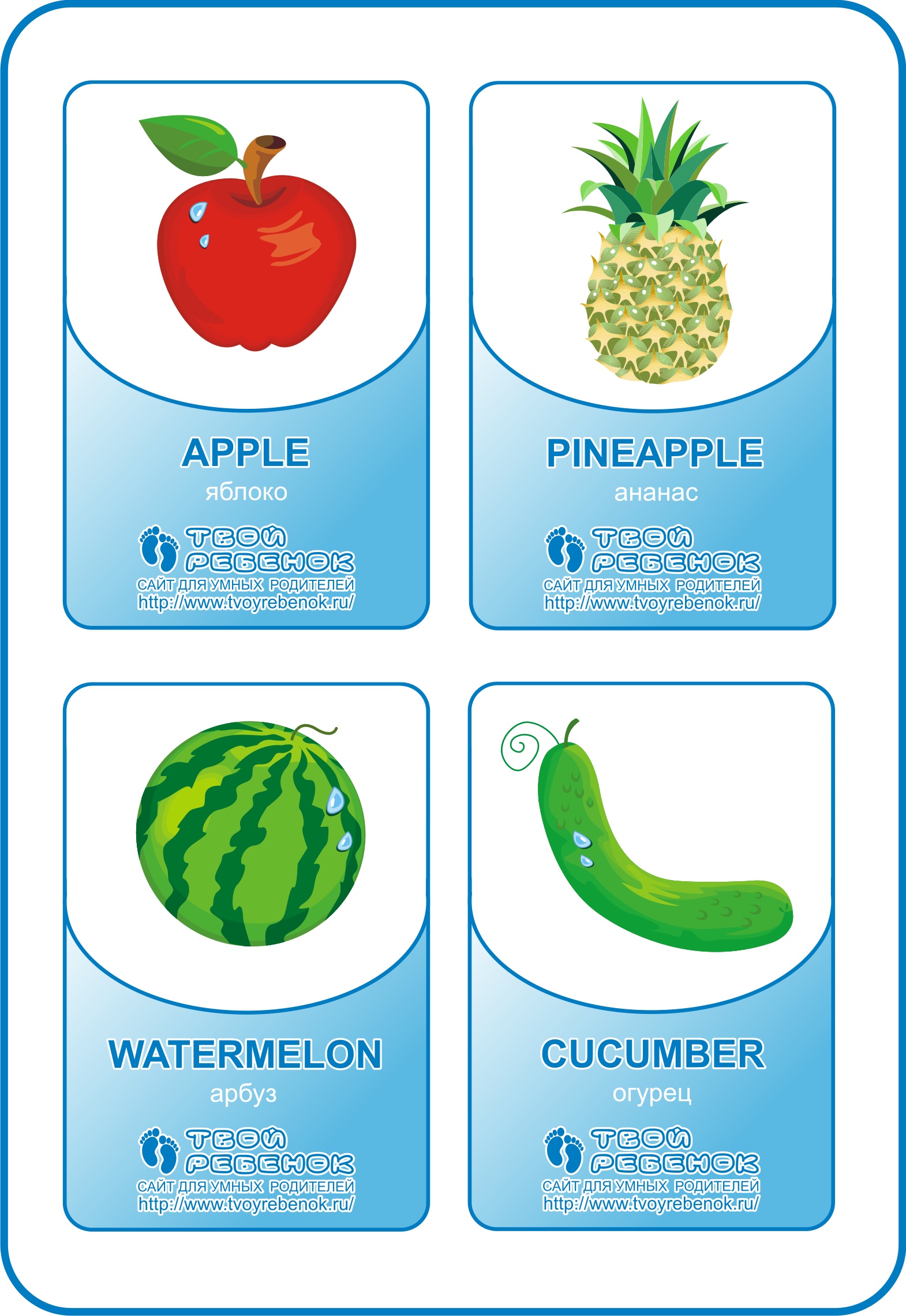 Картинки на англійській мові на тему Фрукти, овочі, ягоди - скачайте безкоштовні матеріали, підготовлені дизайнером сайту "Твій ребенок.ру"! Клацніть на зображення, збережіть його, надрукувати на кольоровому або чорно-білому принтері. Формат матеріалу - А4.
