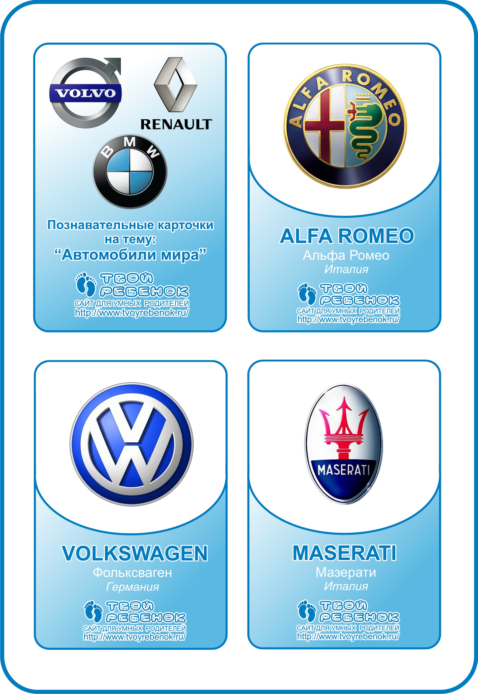 Дидактичні картки для дітей на тему "Марки автомобілів". Представлені марки: Альфа Ромео, Фольксваген, Мазераті