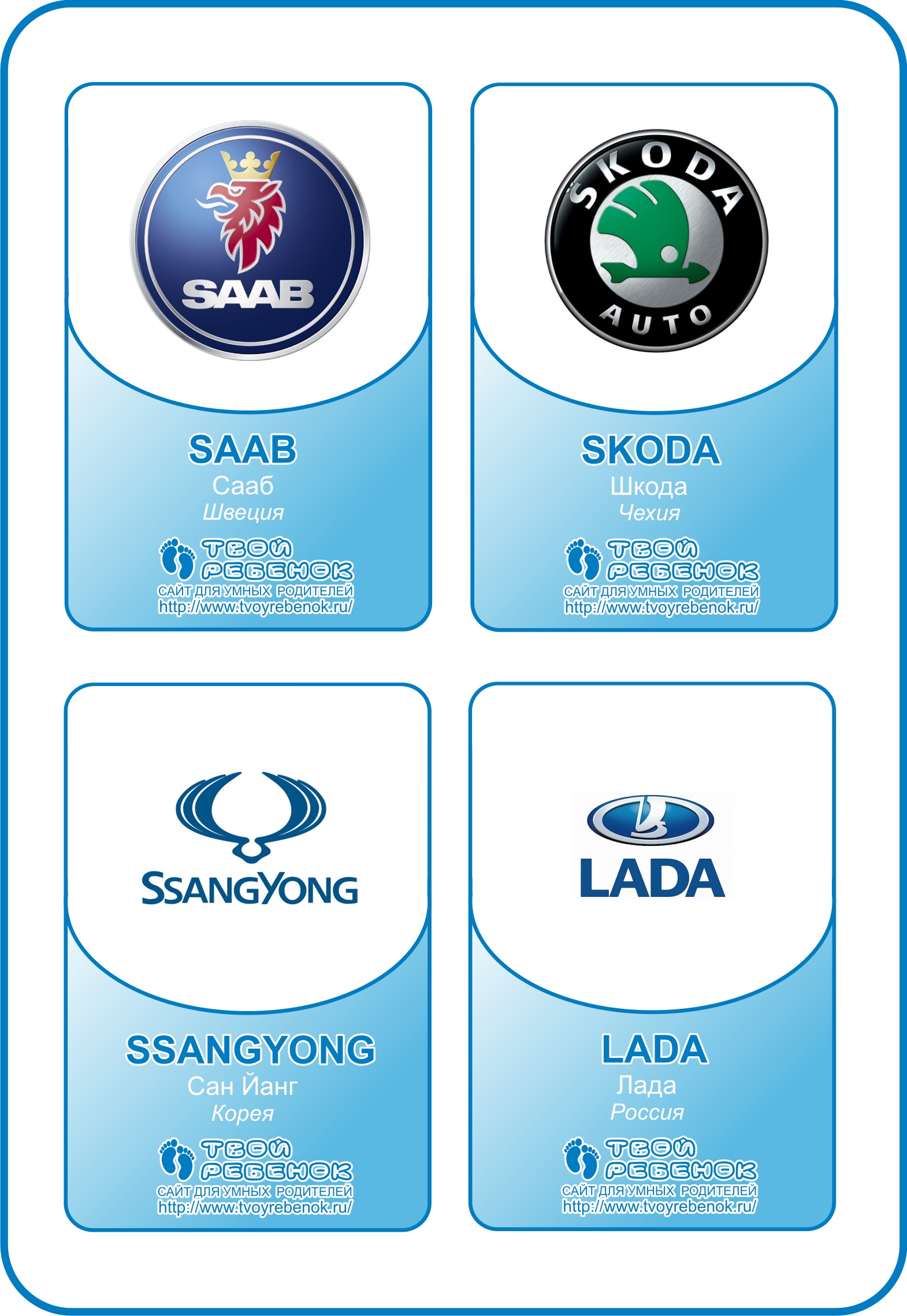 Дидактичні картки для дітей на тему "Марки автомобілів". Представлені марки: Сааб, Шкода, Сан Йанг, Лада