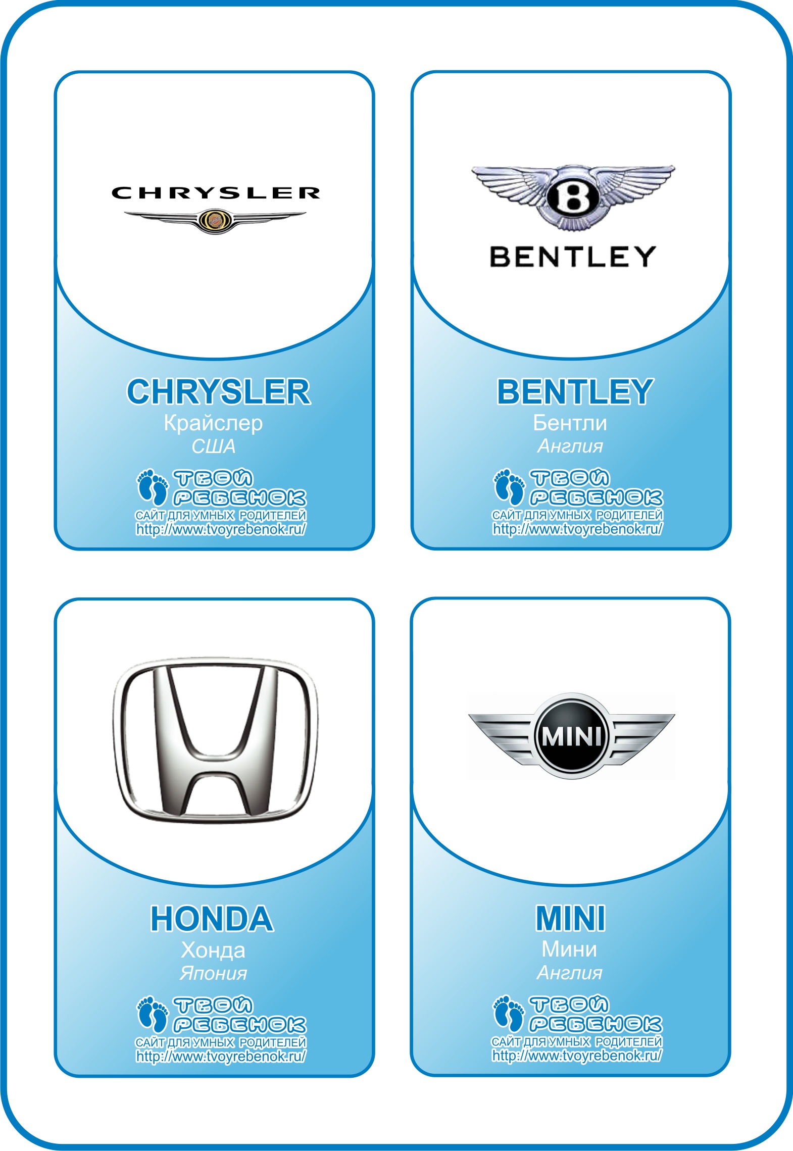 Дидактичні картки для дітей на тему "Марки автомобілів". Представлені марки: Крайслер, Бентлі, Хонда, Міні