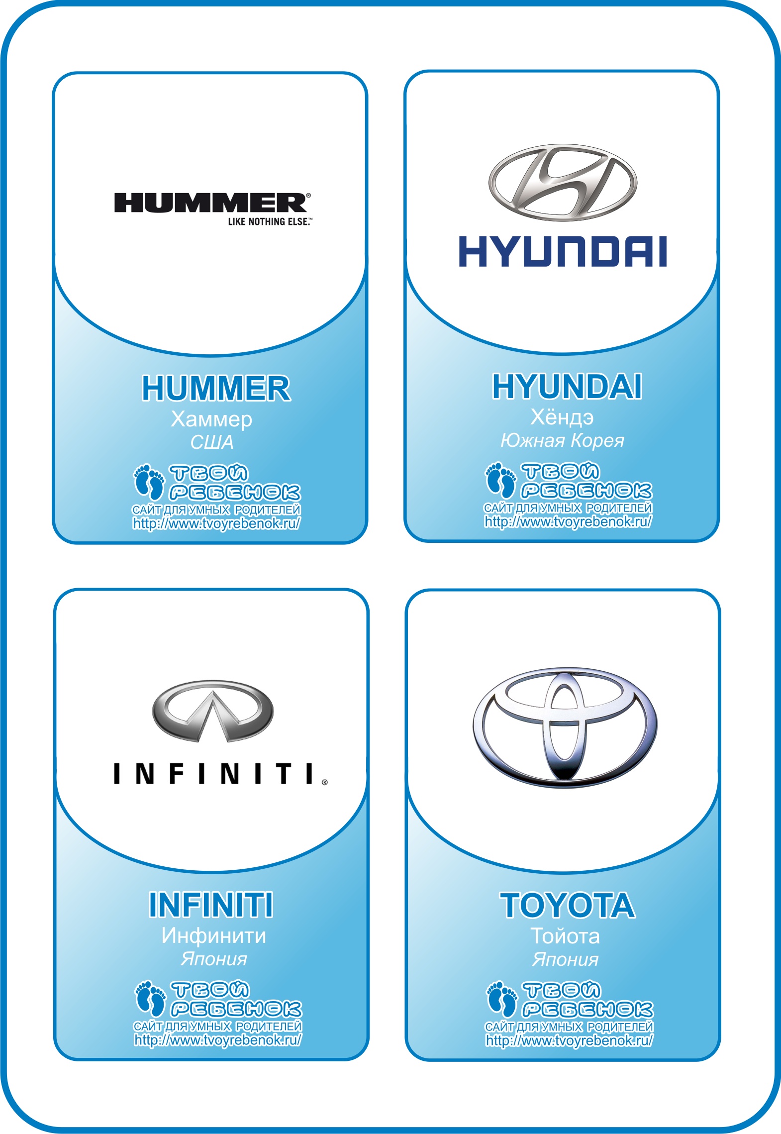 Дидактичні картки для дітей на тему "Марки автомобілів". Представлені марки: Хаммер, Хундай, Інфініті, Тойота