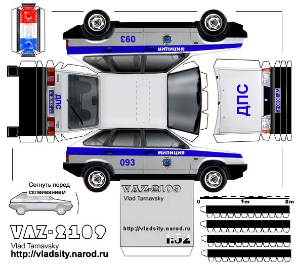Міліція (поліція) з паперу, представлена детальна схема збирання. Роздрукуйте міліцейський автомобіль на принтері, зігніть і склейте. Модель виконана в масштабі 1:32 і дуже реалістична.