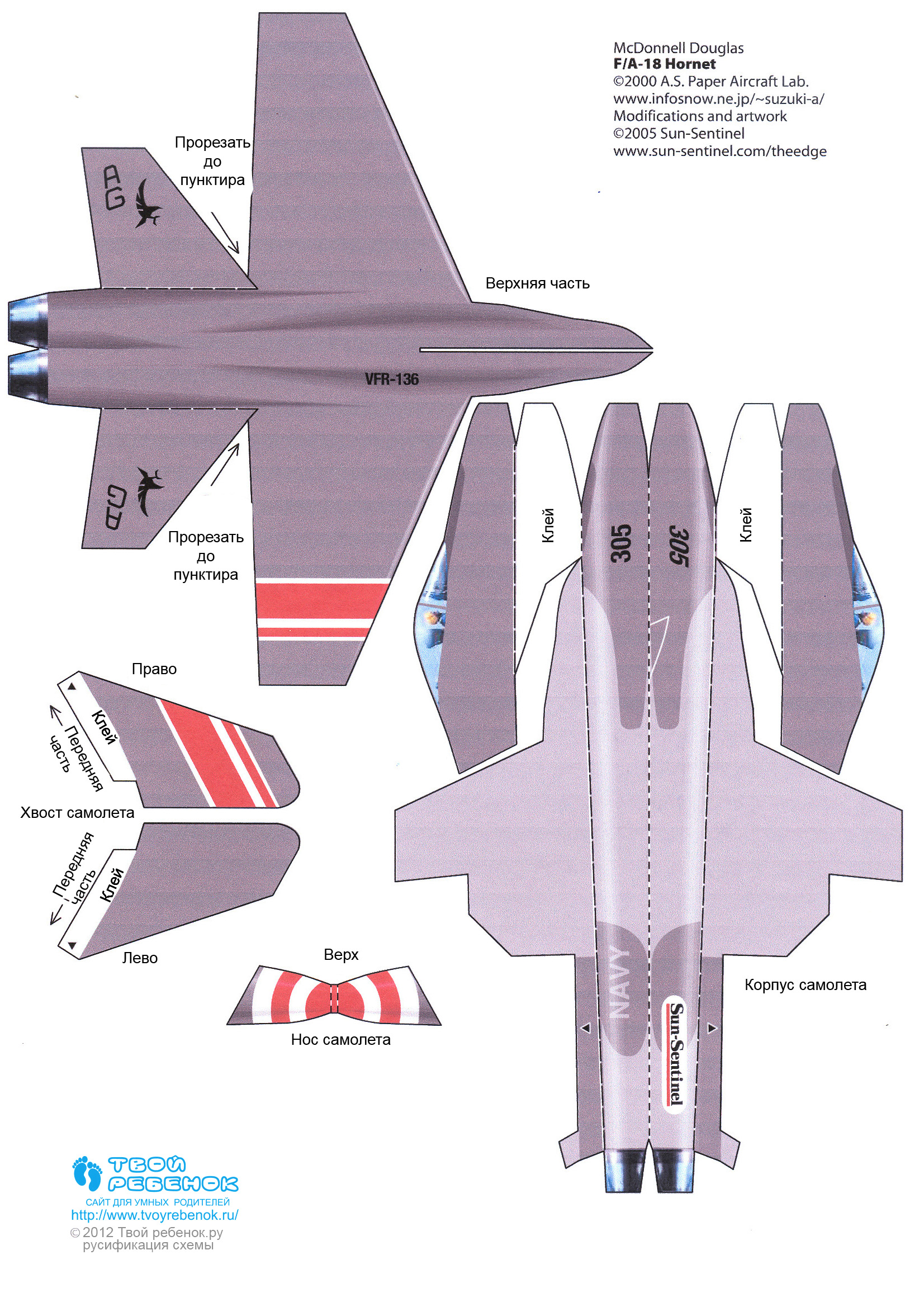 Матеріал переведений спеціально для сайту "Твій ребенок.ру", копіювання дозволяється за умови встановлення прямого зворотнього посилання на сайт "Твій ребенок.ру" і збереження логотипу проекту на макеті літака та інструкції щодо його складання.