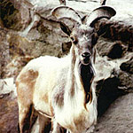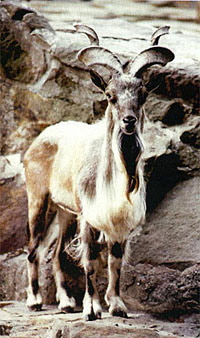 Мархур. У нього незвичайні виті рогу, спрямовані вертикально вгору. Мархур може підійматися по стрімких скелях, щоб поласувати ніжним листям дерев.