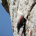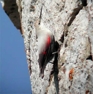 Краснокрылый стенолаз. У цієї птиці оперення на тулубі сіре, а на крилах чорно-червоне. Вона швидко перебирає моторними лапами по стрімких скелях, досліджуючи тріщини в пошуках комах, якими харчується.