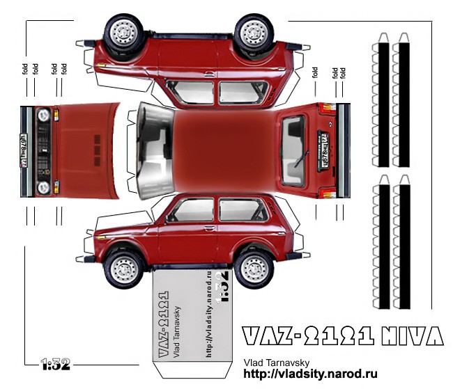 Нива з паперу - вітчизняний позашляховик для паперового моделювання. Роздрукуйте схему на кольоровому або чорно-білому принтері, зігніть і склейте. Модель виконана в масштабі 1:32 і дуже реалістична.