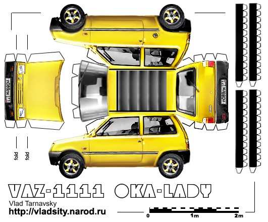 Популярна модель малолітражного автомобіля ОКА з паперу. Роздрукуйте схему на кольоровому або чорно-білому принтері, зігніть і склейте. Модель виконана в масштабі 1:32 і дуже реалістична.