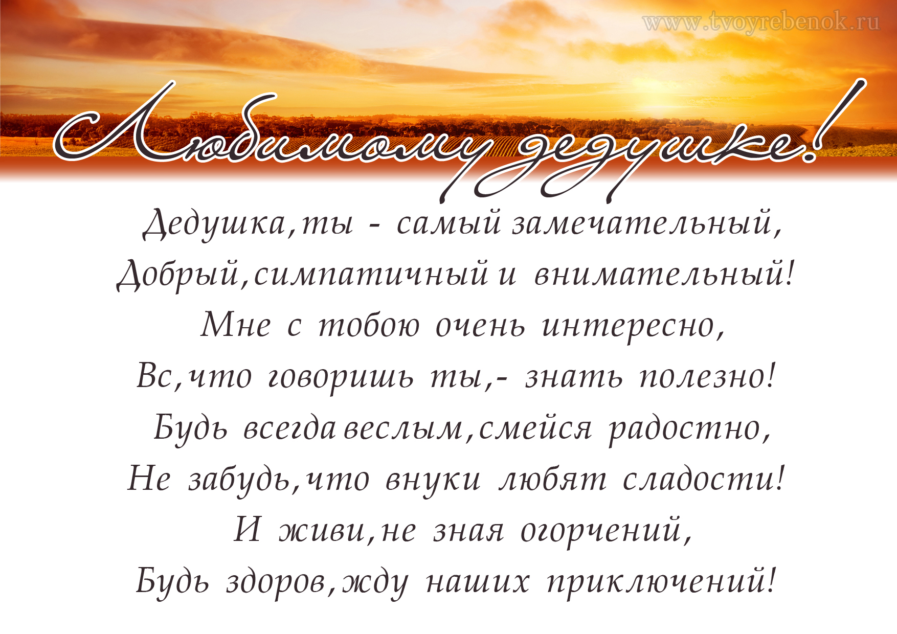 Листівка улюбленому дідусеві, яку можна завантажити безкоштовно на дитячому сайті Твій ребенок.ру! Збережіть файл на свій комп'ютер, роздрукуйте його і привітайте улюбленого діда з святом!