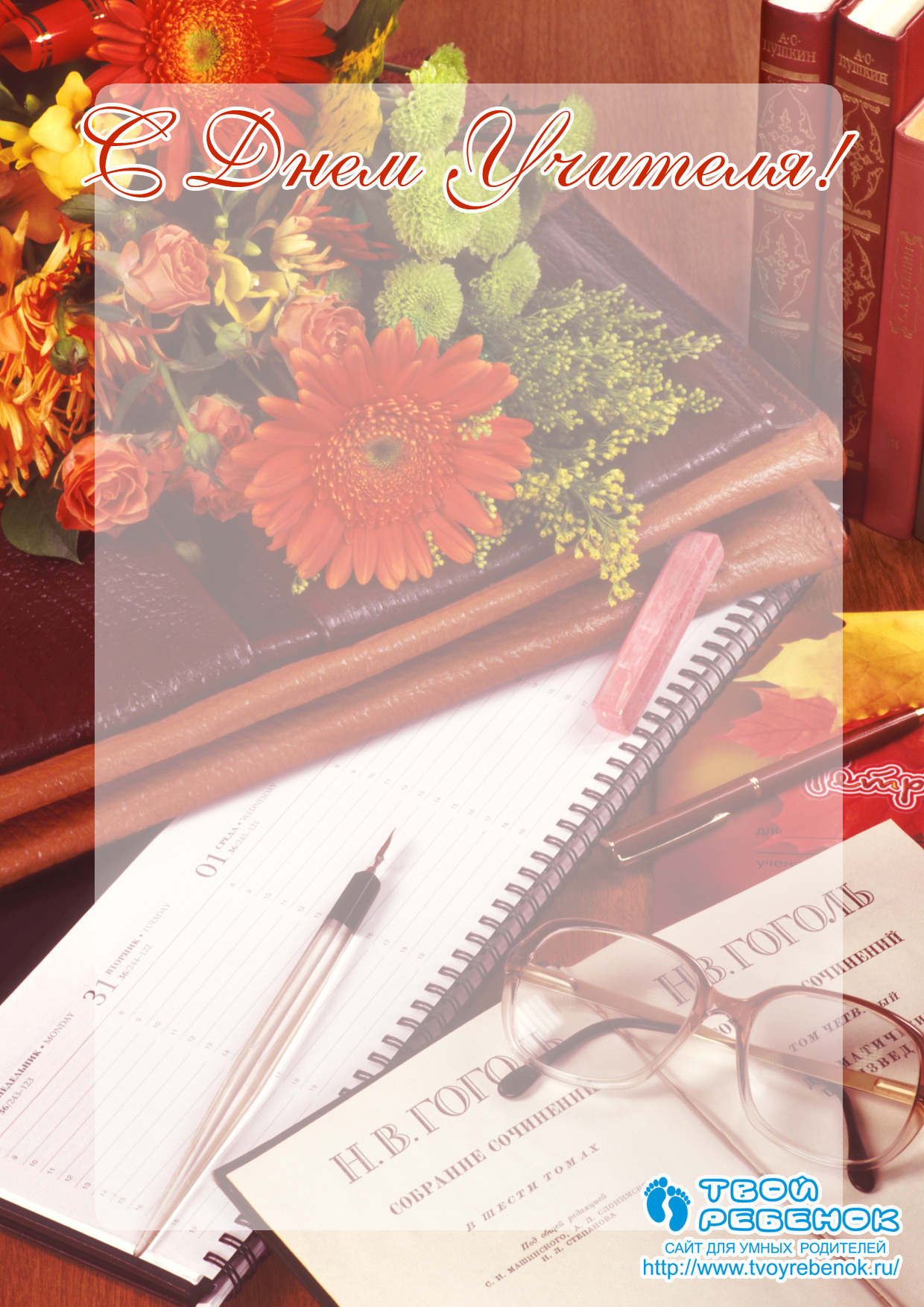 Листівка вчителю літератури від дизайнера сайту Твоя дитина, яку можна скачати безкоштовно! Привітайте свого улюбленого вчителя красивою листівкою!