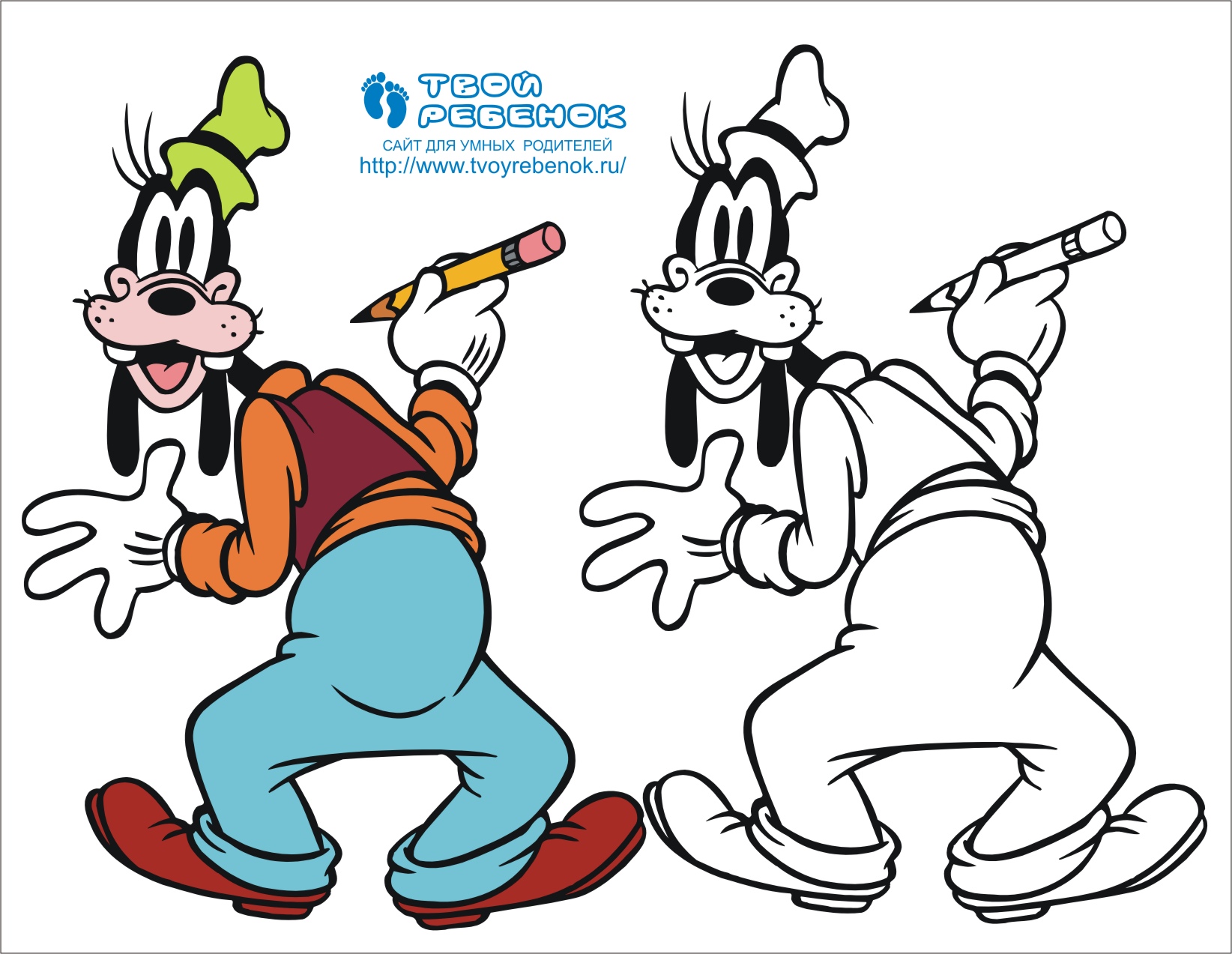 Картинки Гуффі (Дісней) для дітей. Скачайте розмальовку та роздрукуйте її на кольоровому принтері. Ви можете завантажити цю розмальовку безкоштовно.