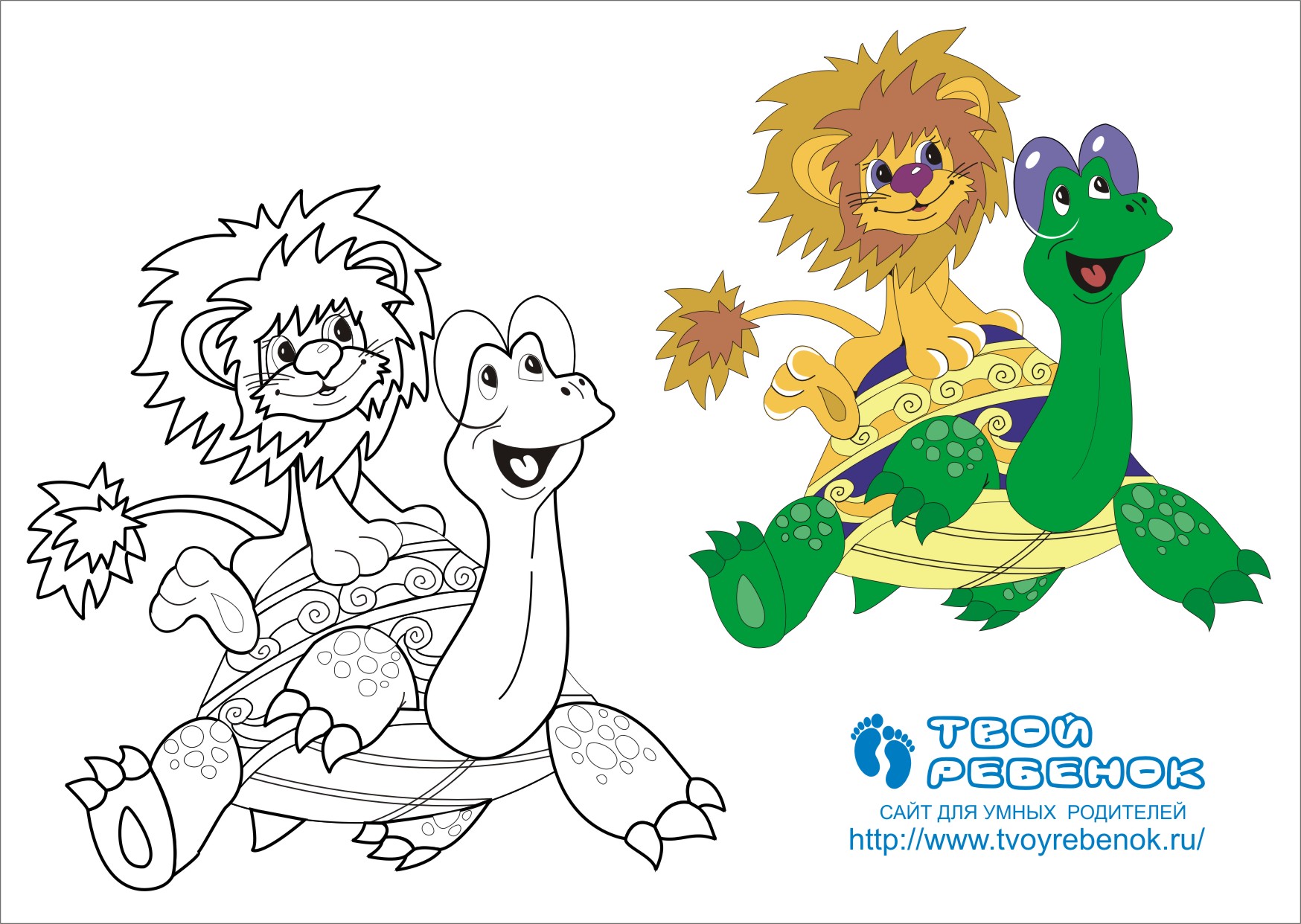 Розмальовка Левеня і Черепаха - скачати безкоштовно від дизайнера дитячого сайту Твій ребенок.ру! Скачайте розмальовку та роздрукуйте її на кольоровому принтері для своєї дитини!
