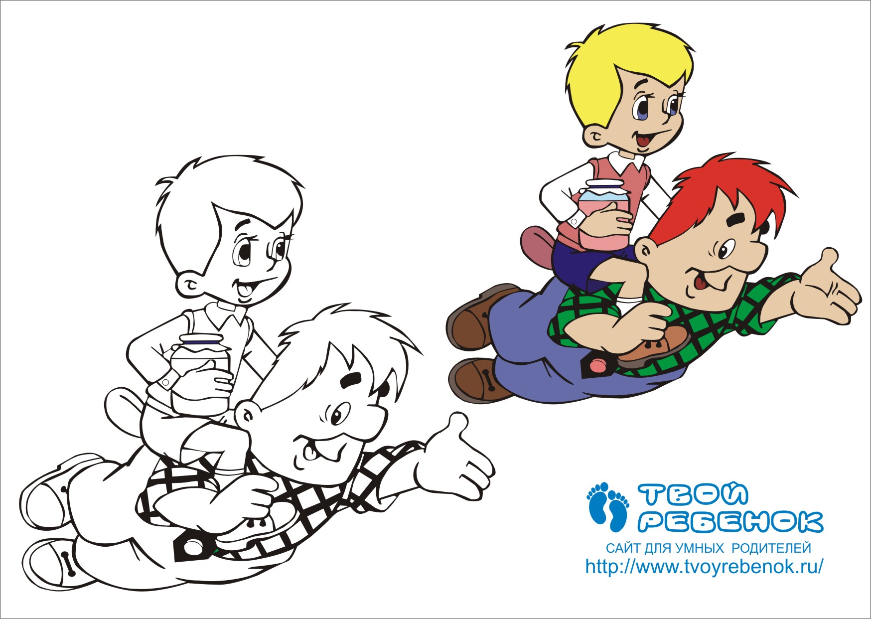Розмальовка Малюк і Карлсон для дітей, яку можна безкоштовно завантажити і роздрукувати на кольоровому принтері прямо зараз! Авторська розфарбування, безумовно, порадує малюка!