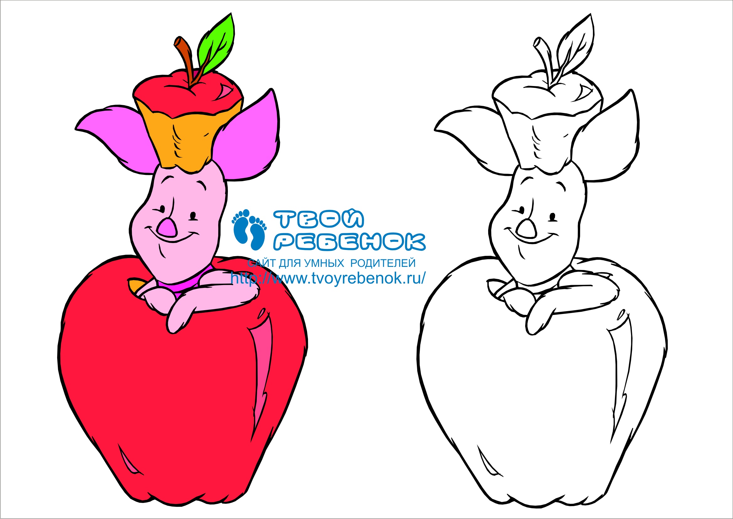 Розмальовка для дітей "П'ятачок в яблуці". Ви можете завантажити цю розмальовку безкоштовно і роздрукувати її на кольоровому принтері. |