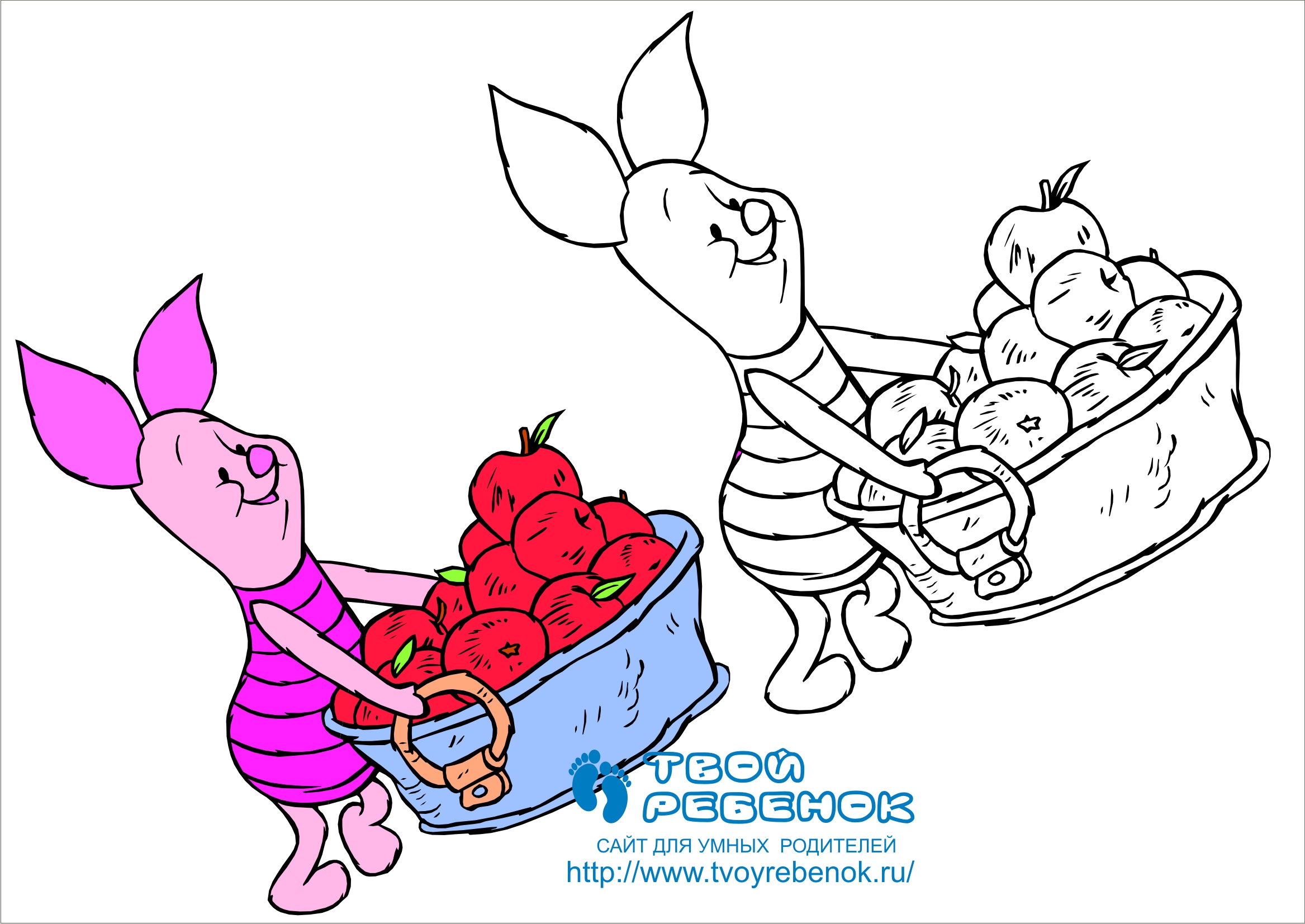 Розмальовка для дітей "П'ятачок несе фрукти". Ви можете завантажити цю розмальовку безкоштовно і роздрукувати її на кольоровому принтері. |
