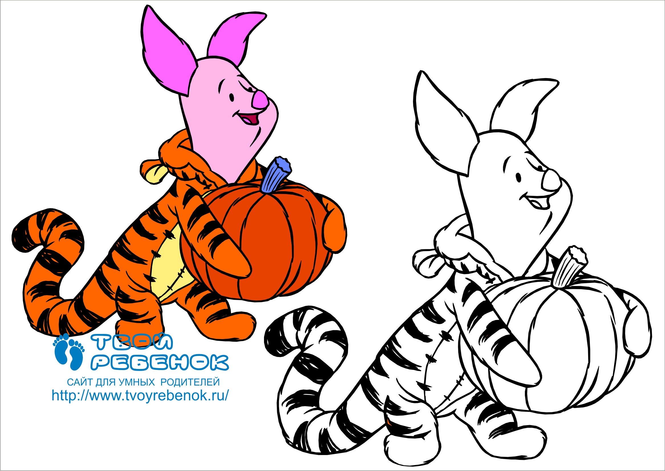Розмальовка для дітей "П'ятачок в костюмі тигра". Ви можете завантажити цю розмальовку безкоштовно і роздрукувати її на кольоровому принтері. |