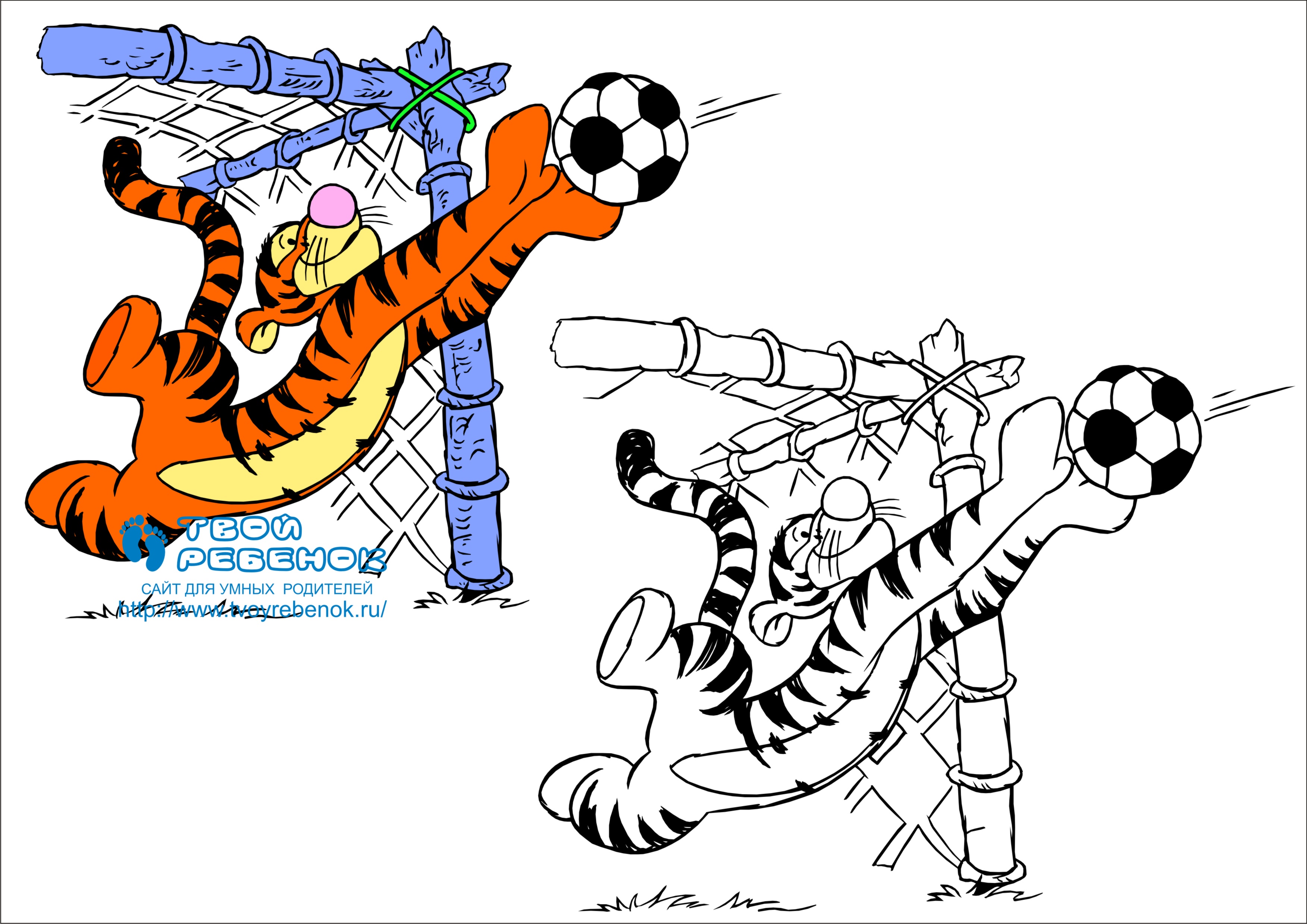 Розмальовка для дітей "Тигруля ловить футбольний м'яч". Ви можете завантажити цю розмальовку безкоштовно і роздрукувати її на кольоровому принтері. |