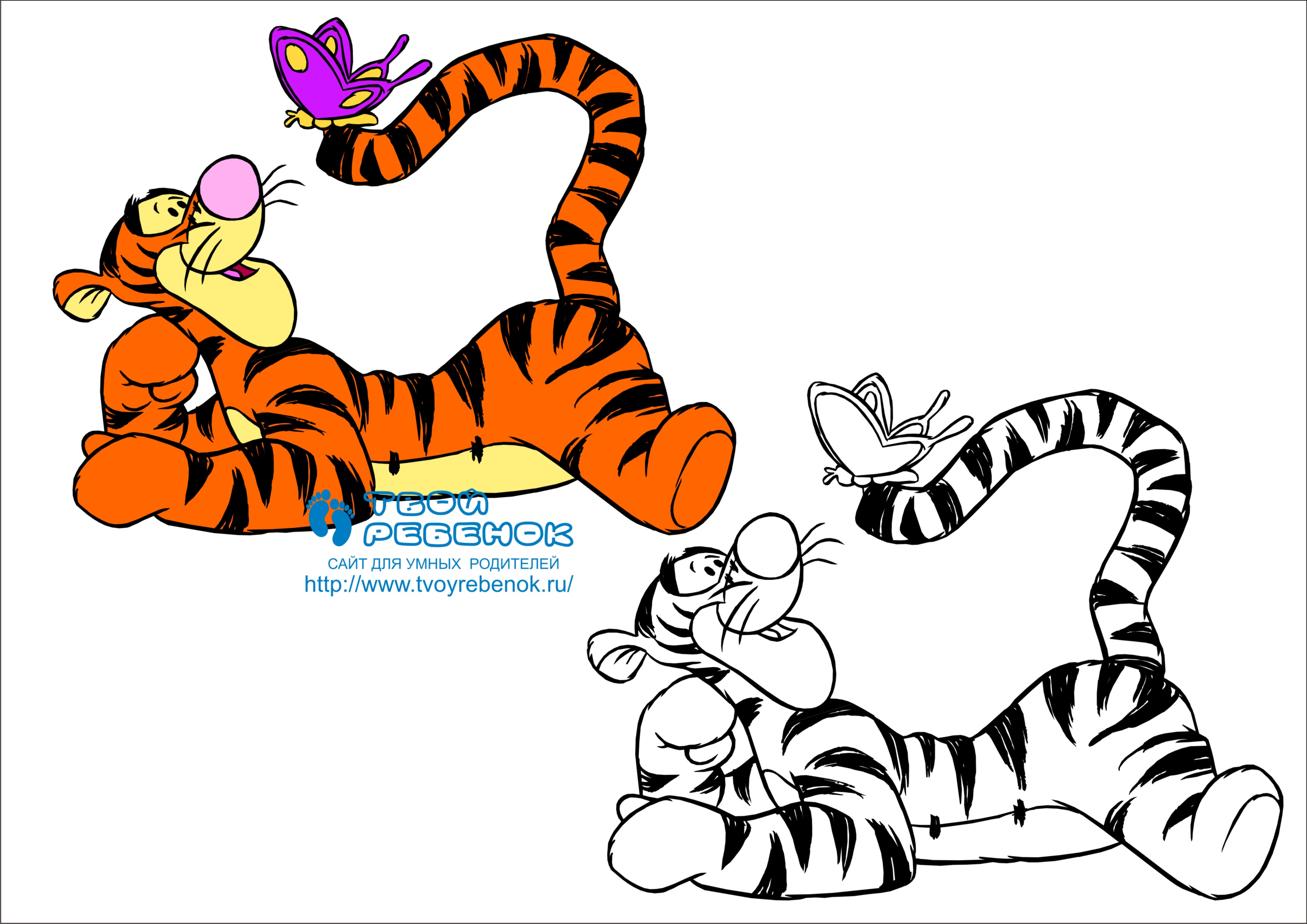 Розмальовка для дітей "Тигра дивиться на метелика". Ви можете завантажити цю розмальовку безкоштовно і роздрукувати її на кольоровому принтері. |