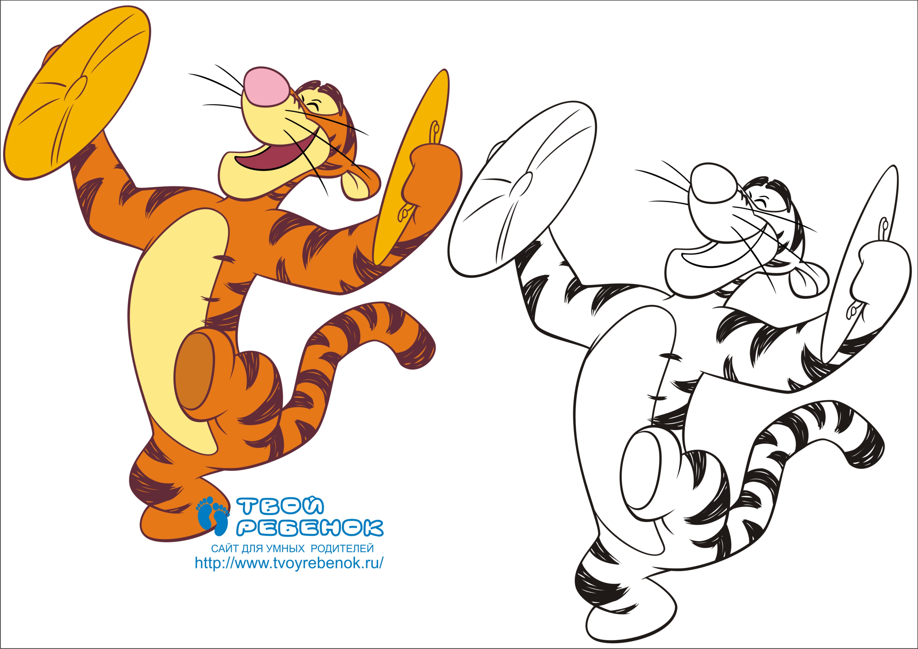 Розмальовка для дітей "Тигра грає в тарілки". Ви можете завантажити цю розмальовку безкоштовно і роздрукувати її на кольоровому принтері. |