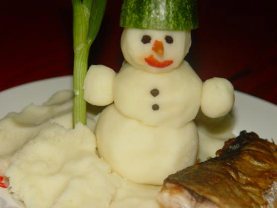 Промити і очистити картопля, бульби розрізати на 4 частини і варити в підсоленій воді 15-20 хвилин, воду злити, картоплю потовкти, додати масло, молоко сіль. Пюре має бути приємною консистенції, не надто сухим і не дуже рідким. На тарілочку розкласти пюре як основу, зліпити три кульки різних розмірів, встановити їх один на інший, ручки сніговика закріпити зубочисткою, прикрасити оченятами, головним убором і т.п. До пюре можна подати рибу.