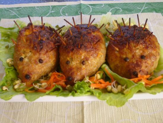 Надаємо форму їжачка, витягуємо мордочку і носик. З чорного перцю робимо очі й кінчик носа, а з поламаних спагетті голки.