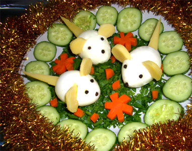 Вирізаємо з твердого сиру (сир можна замінити шинкою) вушка і хвостики вставляємо в надрізи.