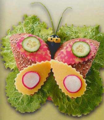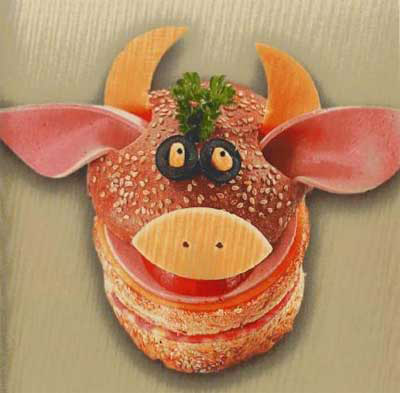 Вам знадобиться: 1 булочка, 1 скибочка шинки, 2 скибочки сиру, 1 чорна маслина без кісточки, 1 зернятко кукурудзи, 2 ікринки, 2 кружечки огірка, 2 кружечки редиски, 4 аркуша зеленого салату, 1 гілочка петрушки, вершкове масло або майонез.
