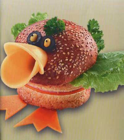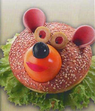 Вам знадобиться: 1 булочка, 4 скибочки сиру жовтого кольору, 1 скибочка сиру оранжевого кольору, 2 скибочки вареної ковбаси, 1 чорна маслина без кісточки, 2 зернятка кукурудзи, 2 ікринки, 1 колечко червоного солодкого перцю, 1 гілочка петрушки, вершкове масло або майонез.