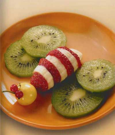 Вам знадобиться: 1 банан, 1 яблуко, 1 жовта черешня з черешком, 2 ягідки червоної смородини на плодоніжках, 1 ківі.