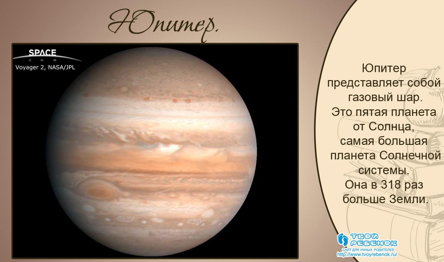 Юпітер являє собою газовий кулю. Це п'ята планета від Сонця, найбільша планета Сонячної системи. Вона в 318 разів більше Землі.