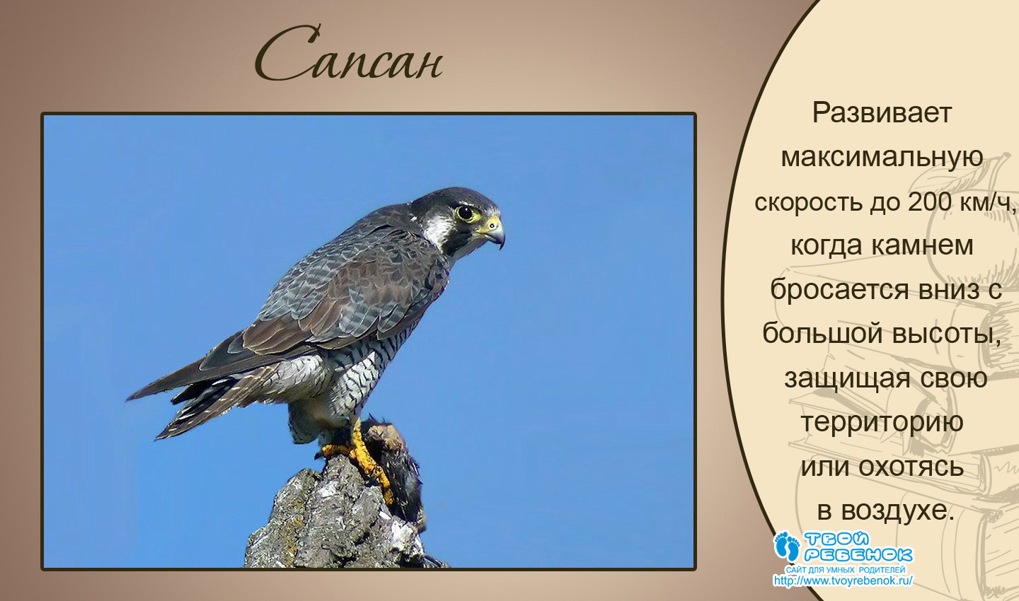 Спостереження, схоже, підтверджують, що сапсан (Fаlсо peregrinus) здатний розвивати максимальну швидкість до 200 км/год, коли він каменем кидається вниз з великої висоти, захищаючи свою територію або полюючи на птахів у повітрі.