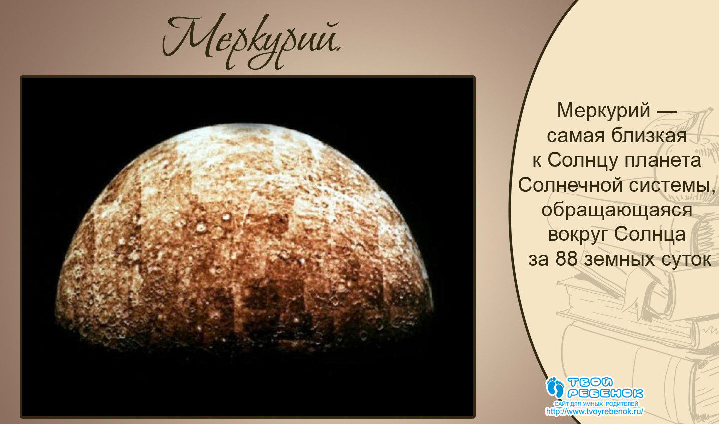 Меркурій - найближча до Сонця планета Сонячної системи, обращающаяся навколо Сонця за 88 земних діб. За своїм фізичним характеристикам Меркурій нагадує Місяць.