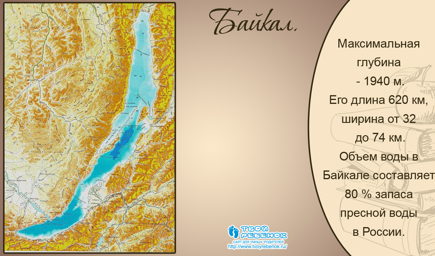 Максимальна глибина - 1940 метрів. Його довжина 620 кілометрів, ширина від 32 до 74 кілометрів. Об'єм води в Байкалі складає 20 % світового запасу прісної води і 80 відсотків запасу прісної води в Росії.