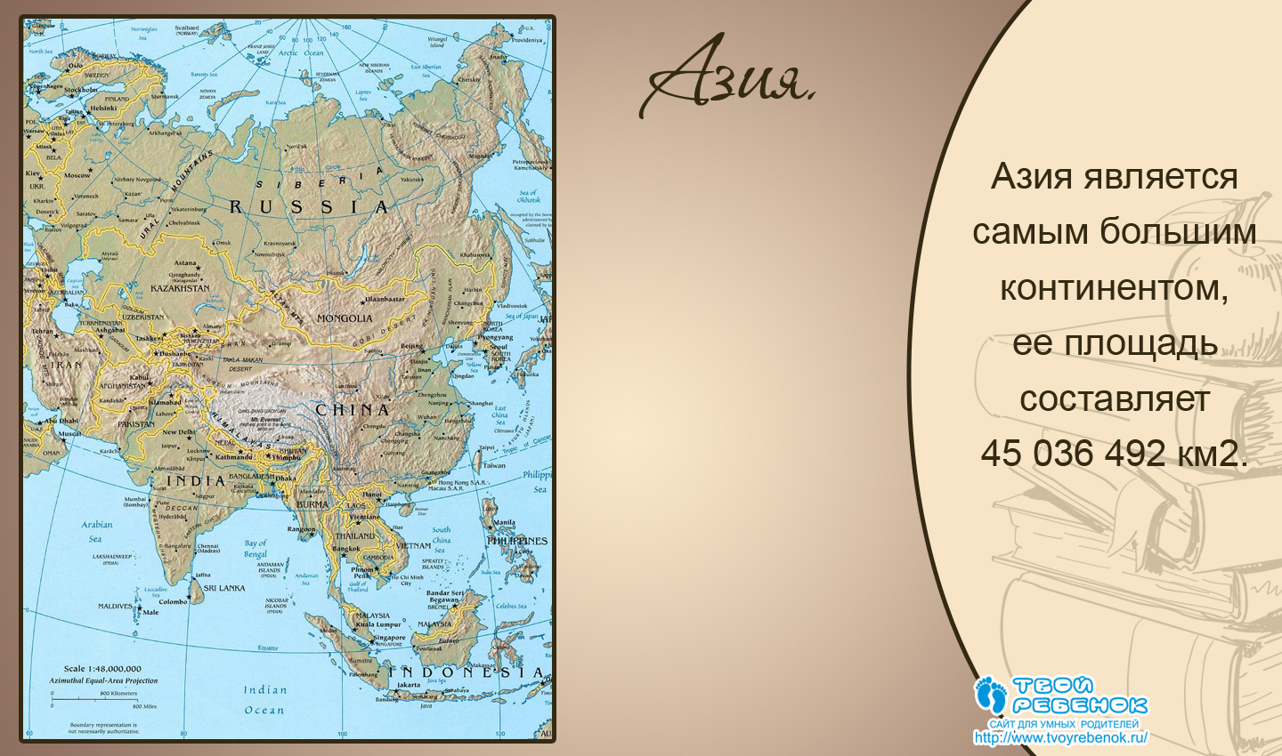 Азія є найбільшим континентом, її площа становить 45 036 492 км2. Друге місце займає Африка, площею 30 343 578 км