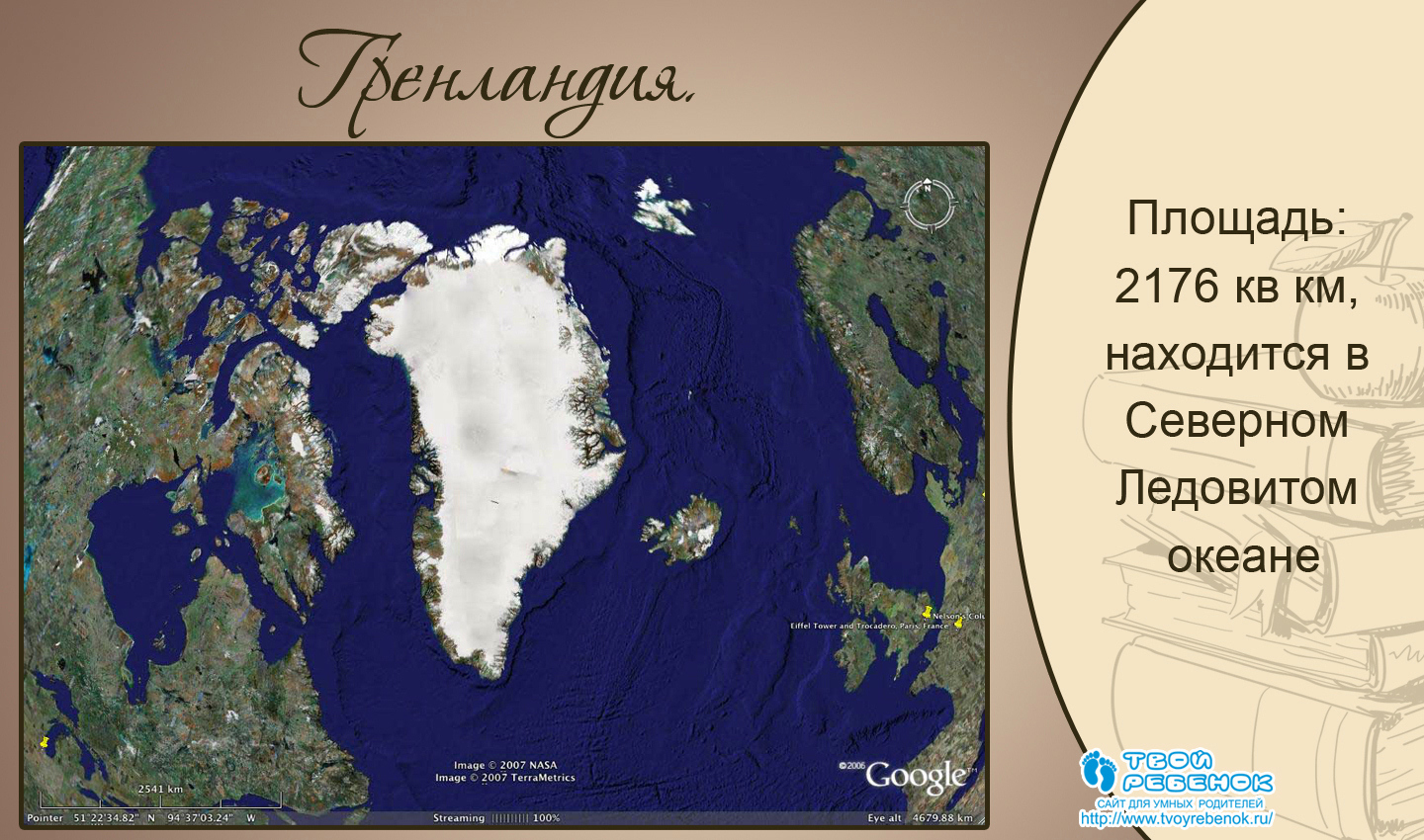 Острів Гренландія, площа: 2176 кв км, знаходиться в Північному Льодовитому океані.