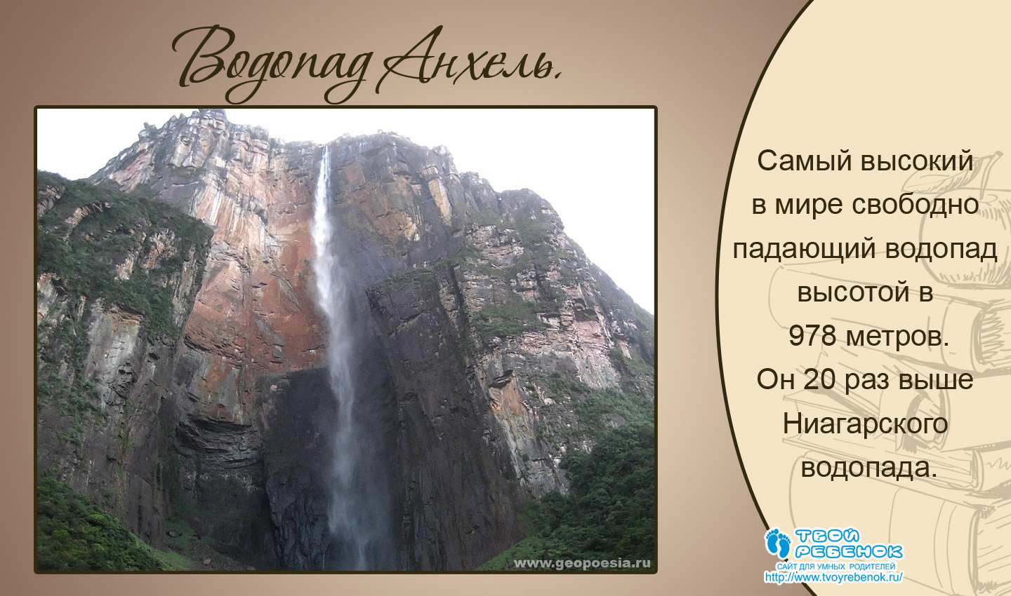 Водоспад Анхель (Angel) або Салтів Анхель (Salto Angel) - найвищий у світі вільно падаючий водоспад висотою в 978 метрів. Водоспад майже вдвічі вище найвищої будівлі в світі.