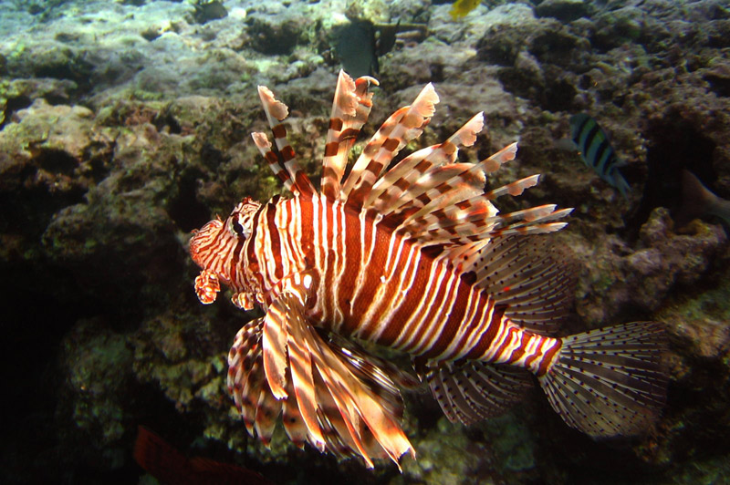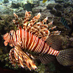 Крилатка-зебра. Її ефектний зовнішній вигляд таїть в собі серйозну небезпеку - на спині у цієї риби знаходиться плавець, що виділяє отруту такий же сильний, як отруту кобри.