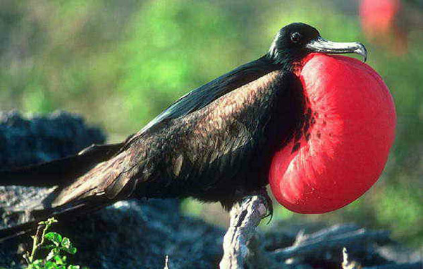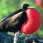 Фрегат. Самець цієї великої, що живе на берегах теплих морів, під час залицяння роздуває величезний яскраво-червоний зоб, щоб привернути увагу самки.