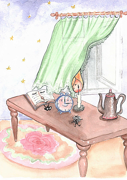 Будильник остаточно прокинувся. В кімнаті хоч і було світло, але розгледіти дивне дзижчить істота було складно. Поряд з Будильником на столі жила Книга, Свічка і Чайник. Будильник озирнувся. Чайник мирно дрімав, випускаючи з носика залишки денного пара. Книга так озябла під вітром, що закуталась у власні сторінки і завмерла, а Свічка...